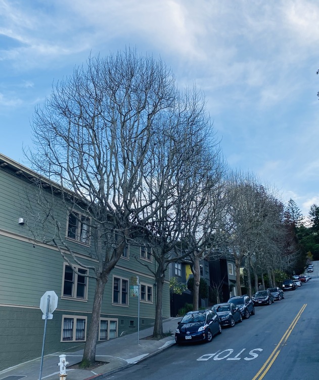Continue west on 17th until you reach Stanyan Street, cross Stanyan, and turn right to head north on Stanyan As you cross the street, look to the left - almost the entire long block of Stanyan between 17th and Belgrave at the top of the hill is planted with American sweetgum trees, native from the Alleghenies through Mexico to Central America. The scientific name is Liquidambar styraciflua. These trees tend not to lose their leaves until the new leaves come in the Spring, so by December and January they are providing fall color.