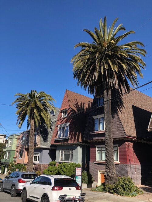 At 1018 Shrader is a mature Canary Island date palm, native to the Canary Islands. The scientific name is Phoenix canariensis. This is the palm tree that lines upper Market Street, and is also found along the Embarcadero and in the median of Dolores Street. There is another Canary Island date palm at 1024 Shrader. This is my favorite palm tree in San Francisco – it has a beautiful, stately form, and it thrives in our cool coastal climate. Sadly, it is under attack from fusarium wilt, a recently introduced disease that kills any tree that contracts it. As a result, the tree is no longer planted in San Francisco.