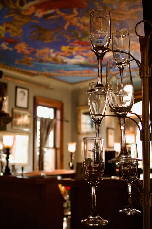 From 1981 to 2005, the Castle was owned by Fred Eagle Royce, a prominent Kalamazoo lawyer and Freemason. The ceiling is one of his contributions: hand-painted by a local artist to depict the constellations, with tiny fairy lights set into the stars. Look up at the ceiling to see the details created.