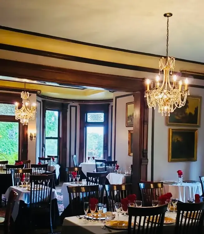 Lets now head to the main dining area which is right off the lobby. This room was once the Henderson family’s parlor for entertaining guests. Above us, at the base of the King’s Tower, a stained-glass window holds an evil eye which is meant to guard the Castle against spirits and unwelcome visitors. And it may be needed…Henderson Castle is consistently ranked among the top three most haunted places in Michigan.