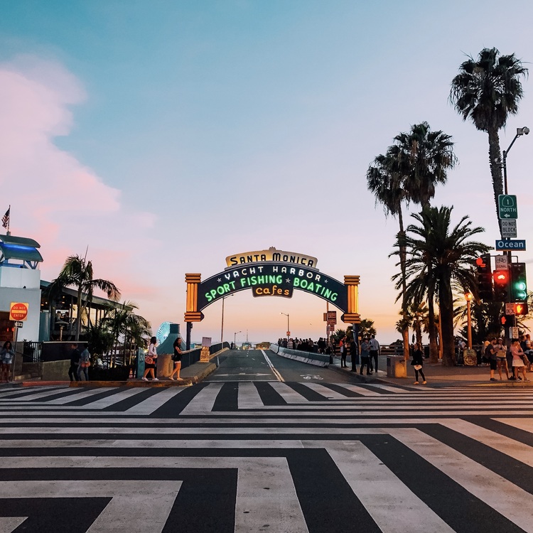 As we continue south on Ocean Ave. and cross over Colorado Street look to your right and you will see the famous Santa Monica Pier and its iconic Arch Neon Sign.