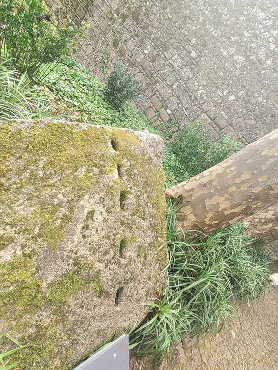 Evidence of block extraction using wooden wedges is visible. To divide granite rocks into blocks, either existing natural fissures in the rock were utilized, or new incisions were made, into which dry wooden wedges were inserted under pressure. Subsequently, the wedges were soaked in water, leading to their expansion and exertion of pressure, resulting in the separation of the rock into blocks along fracture lines.