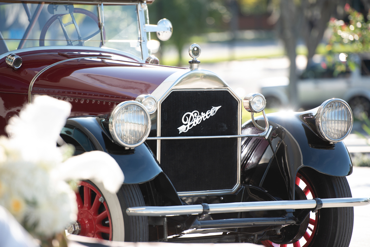 This beautiful car has the trademark fender headlights Pierce-Arrow is known for. The lights were molded into the fenders to give the car a fancy-looking design. Now that most of the technical details had been worked out in the early Brass Era automobiles, car makers were free to focus on beautiful designs. And with the Art Deco design style right around the corner, automobiles began to take on the design elemens of this popular design trend that was also seen in furniture, buildings, and clothes: swooping curves, repeating lines, even details that looked like airplanes!