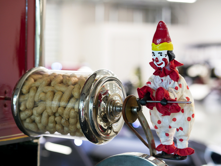 Popcorn vendors wheeled their popcorn wagons right up to the theater to provide freshly popped kernels and candy to long ago theater patrons. A fancy popcorn wagon like this was very expensive! Even in the early 1900s this wagon cost a thousand dollars! Look at the little clown turning the popcorn warmer. Under the clown is a tiny steam engine!