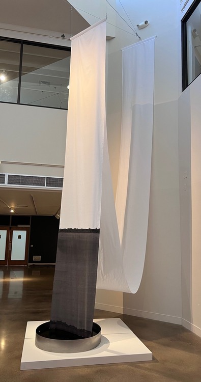 An ocean of white fabric swoops down from the wall, then up again suspended high above, finally plunging into a steel reflection pool of black fabric dye and water. Meant to express something of time and change, the large fabric sculpture remains in contact with the dye, the process is not complete – it is active and ongoing.