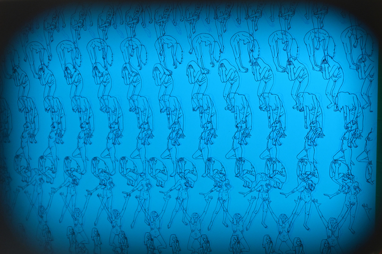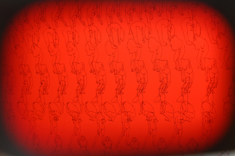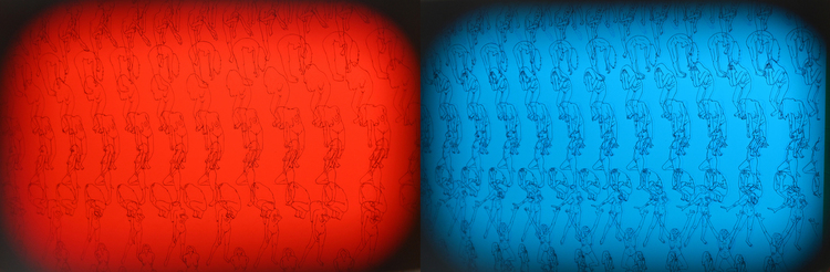 “GOOD THINGS COME TO THOSE WHO WAIT” is an anaglyph drawing representing a "symbolic immigration body map" chronicling the 24 years I have lived in America since first immigrating to Denver, Colorado in 1999. Using data art, mapping and performance, the 24 horizontal lines represent biographical responsive body movements to learned hardships from each year lived in marginal space. In homage to my love for cinema and the metaverse, the final piece can be experienced with 3D glasses. Viewers should first experience the art wearing the provided 3D glasses using both color lens then cover each eye and view the art through one color. The completed piece contains over 800 nude self portrait figures hand traced in red and blue ink; repetition as raising awareness.