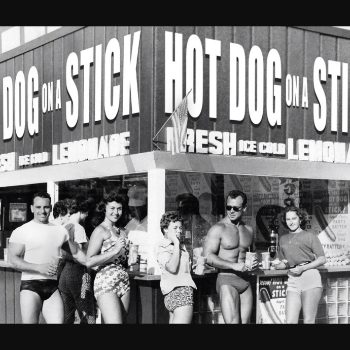 Hot Dog on a Stick opened its first restaurant at this very location in 1946. Dave Barham opened a food stand named Party Puffs here at Santa Monica Pier. Initially offering ice cream cones and lemonade, Barham's life changed when he perfected his mother's cornbread recipe and created the iconic Hot Dog on a Stick. Recognizing its potential, he hit the road, selling his delicious creation at county fairs using his Lincoln Continental as a power source for his portable stands. The vibrant red and white striped uniforms of the Hotdoggers soon became a hit, making Hot Dog on a Stick a mall sensation.