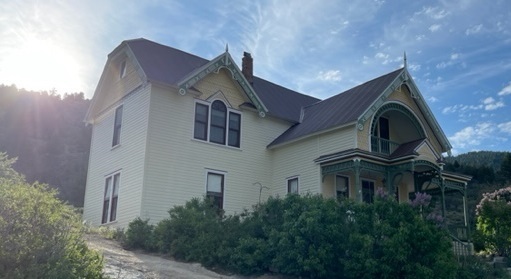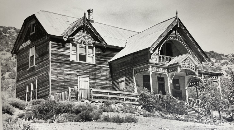 Continue up Morning Star Street. On your right high on the hill is the Stoddard Mansion. One of Silver City’s most beautiful homes, the Stoddard Masion was built in the early 1870s by John Stoddard, a young man from Iowa who came to the area to seek his fortune after serving in the Civil War. While prospecting in the area, he accidently kicked some rocks and discovered a rich lode of gold near DeLamar. He met his wife Mary McMahon on one of his trips to the area, and they were married in the house on September 18, 1870. Stoddard and William Townsend owned a lumber mill near town and used the wood to build the large home. Trim work and “gingerbread” finishes were the handywork of German-born carpenter Otto Patschek, a skilled cabinetmaker of Silver City who also did work on the Lippincott Building and built the cabinet for Colonel W. H. Dewey now displayed in the Owyhee County Historical Museum in Murphy.