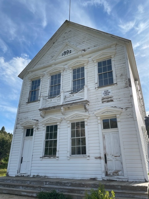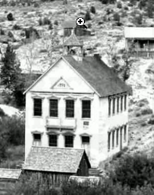 Just up Morning Star Street you will see the large white schoolhouse. The growing town of Silver City built this beautiful schoolhouse in 1892. It was used until 1934 when the county seat moved from Silver to Murphy, and most of the remaining population left too. The school housed all grades in three separate rooms and employed three teachers, one for primary, one for intermediate, and one for high school. They usually hired single people for these jobs and there was a lot of turnover as many younger women were inundated with marriage proposals soon after arriving in town.