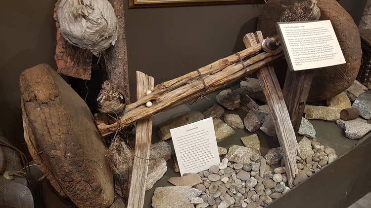 Before the arrival of a flood of settlers, The Hudson's Bay Company brigades carried goods through the Okanagan Valley, behind Summerland. Often, the men packed huge loads on their backs, and sported colorful sashes around their waist, not only to look dashing but to help prevent abdominal hernias. The loads were a standard 180 pounds. In valley bottoms, wagons were used to transport the cargo. An example of one is on display, actually, only half of one. The brigade men were mostly Quebequers, and many place names in the area were French. Skaha Lake, for example, was called Lac du Chien.