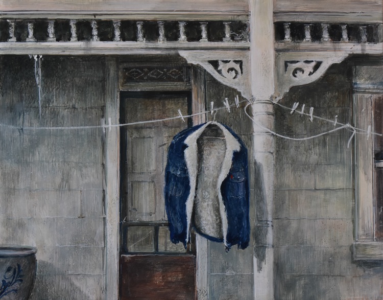 Coat of Blue is painted with egg tempera. My son Noel wore this hand-me-down coat from my oldest brother Brian who had passed away. One day Noel had stacked firewood on the porch and inadverdently left the coat outside. The next morning I awoke to the sound of our wind chimes, stepped outside, and saw the coat. Maybe my brother was communicating with me in some spiritual way.