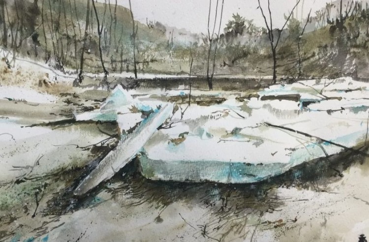I like the bleakness of winter. There's never a shortage of subject matter that's readily exposed after the leaves have fallen and the winds offer their chill. This ink and watercolour study presented the opportunity to use some striking turquoise pigments I recently purchased. The blocks of ice filter the natural light and create exquisite tones of blue. I used that same turquoise pigment in the egg tempera based on this study.