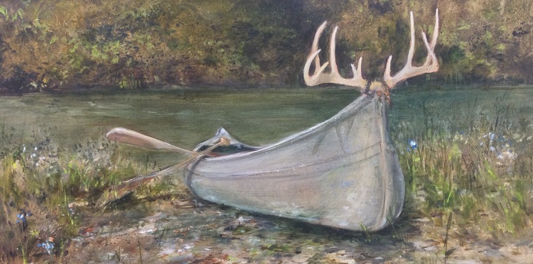 Wild Adventure incorporates my son's Grumman canoe and a set of whitetail deer antlers. It's really a synthetic composition that I staged along the Ontelaunee Stream near my home. I applied varnish and ground silver leaf to the canoe to simulate the sheen of the aluminum.
