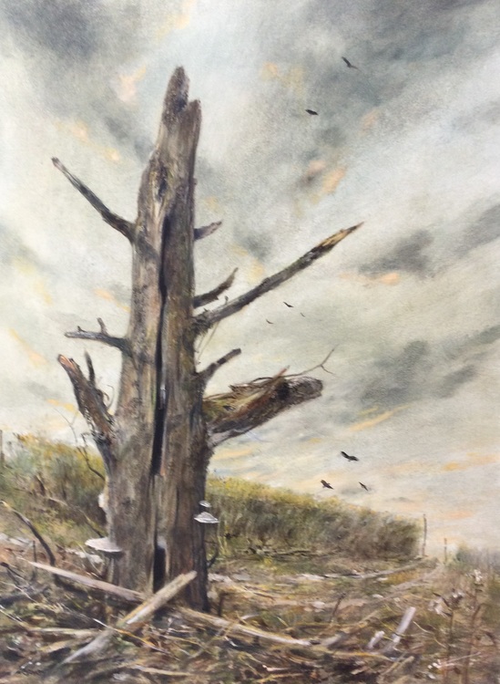 Visitors to my website and art gallery remark that I paint a lot of dead trees. Rightly so. I think trees begin the take on more anthropomorphic features when they are decaying into nothingness. I like to imagine that old trees are imparting some sort of cosmic wisdom, since they've been witness to events and weather I can only conceive.