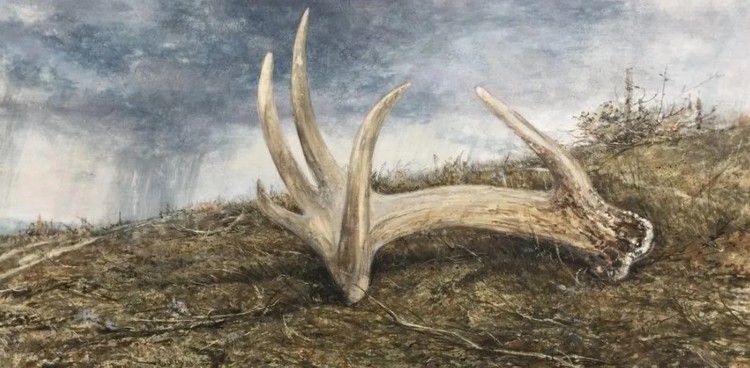 April Wind derives its name from a painting by Winslow Homer. Homer painted a scene where a solitary figure stands on a sloping cliff. The viewer is almost unsure if the background is the raging surf or the blustering sky. I used an antler shed as a prop for this egg tempera, and I fashioned the sky with a hat tip to Homer.