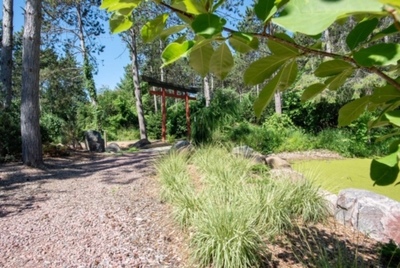 Torii, which is japanese for gates, greet you as you enter the garden and are typical of traditional Japanese gardens. The Meditation Garden is a great space for quiet contemplation and a peaceful atmosphere. It’s patterned after meditation gardens in Asia, by incorporating flowering crabapple trees, rhododendron, viburnum, evergreens and ginkgo trees. Only one part of the Meditation garden has been developed, along the south end of the pond. Eventually we will extend the Meditation Garden to the north, along both sides of the pond. Watch for construction on the western portion this summer. The anticipated master plan includes a Japanese teahouse, an arched bridge over a narrow part of the pond, landscaping of the island, a zen garden, and a viewing platform at the edge of the pond.