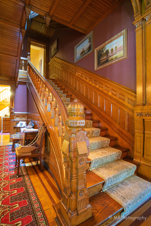 La escalera proporciona una ilusión de grandeza que continúa al segundo piso, dando la apariencia que el segundo piso y el ático tienen tanto detalle como el primer piso.