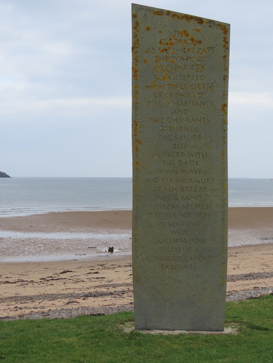 The stone you see before you was erected in 2002 as one of a series of events to mark the bicentenary of the town’s most famous son – Hugh Miller. The words carved in the stone were from a report written by Miller as he witnessed the Cleopatra, an emigrant ship leaving the town to travel to Quebec in 1831. In that year alone 62 ships sailed from the Cromarty Firth with passengers looking to carve new lives for themselves across the Empire.