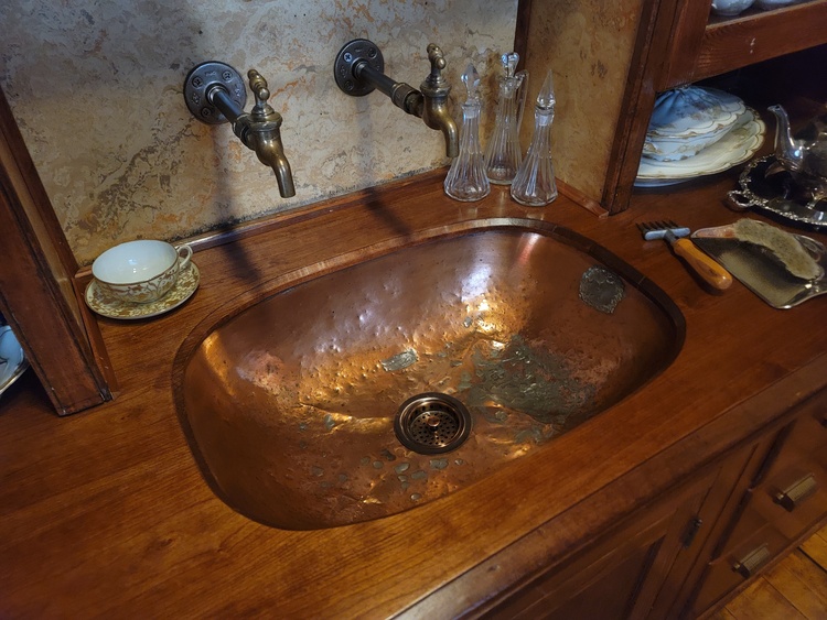 The copper sink is original though it was not originally plumbed. It was an ice sink, known at the time as a “chiller” sink. The butler would break up the ice with a pick and place food on top, using the sink to keep food cold prior to plating. Notice the holes in the bottom from the ice picks. The holes are filled with led-based solder.