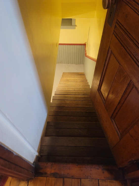 Clearly, we are still on the servants side of the house. This is the Servants Hall. It is plain and undecorated. There are quoins on the corners to protect the walls. The stairs lead down to where the laundry was done and up to where the servant bedrooms were located. A set of stairs dedicated for servant use was designed to separate the servants from the family.