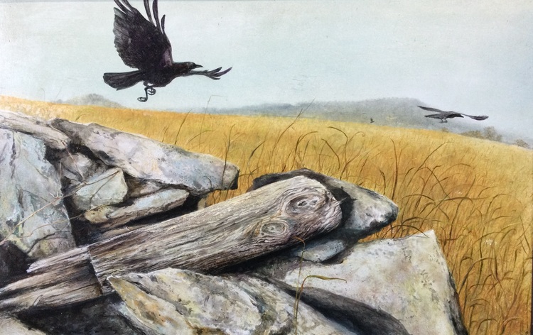 The crows were catching an easy flight on the currents when I observed this scene near Stine’s Corner, PA. I liked the contrast of light and dark, and interplay of the textures on the rocks, wood, and feathers. The birds appeared effortless as they floated along orchard grass. The Pinnacle is off to the distant right.