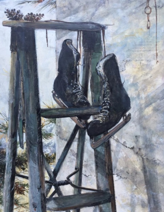 The scene occurred at the historic cottage near Hawk Mountain known as Schambach’s Tavern. I had driven by one day and noticed that my friend Todd Bauman had left his ice skates hanging on a stepladder. Later I returned with my iPad to snap a few images. Those photos were used as guideposts for this egg tempera.