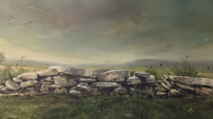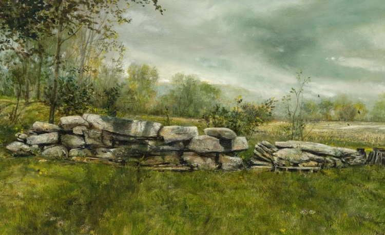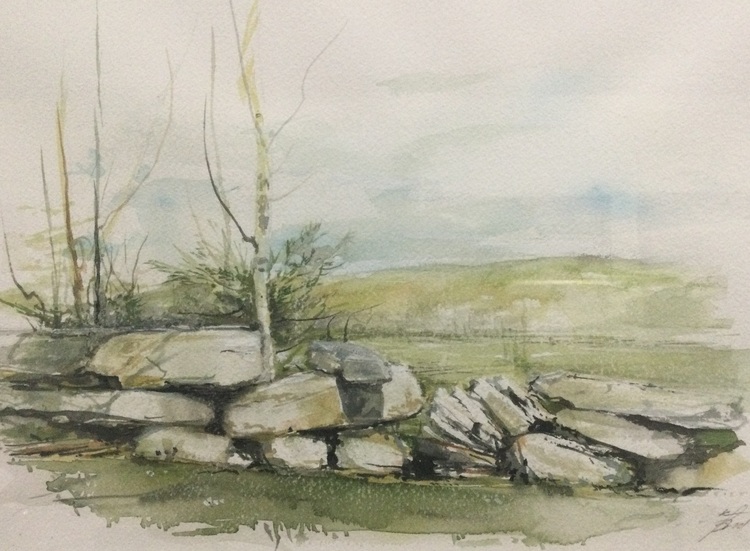 Near my childhood school is a long stack of rocks, placed there in no particular order by Mr. Glenn. I painted five versions of this scene over a period of years. I was interested in capturing how trees cast shadows on rocks and turf. Albany Township seems to be all about stone and wood.