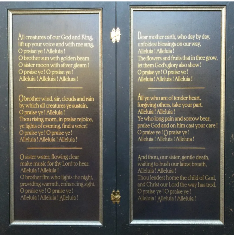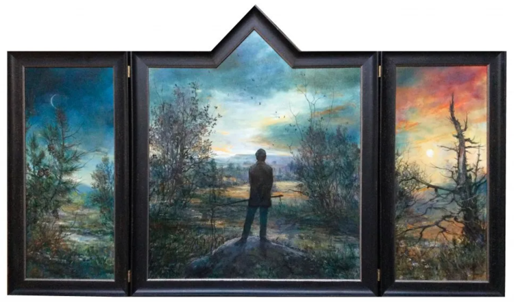 "Ruckenfigur" literally means the "back of a figure." The term was popularized by the 19th Century German romantic painter Caspar David Friedrich. I based this tryptich painting on a popular Christian hymn with words adapted from Saint Francis of Assisi. The central figure invites you to admire the awesome beauty of nature depicted here by the brilliant morning sky on the left, and a blazing sunset on the right. The Pinnacle and a swirl of birds capture the gaze of the viewer in the central panel. The verses of the hymn are on the reverse side of the winged panels.