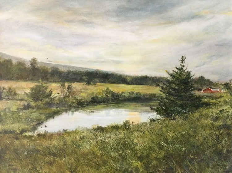 Betsey's Pond is a place I return to again and again. Invariably I'll be greeted by some sort of waterfowl - ducks, geese. herons, egrets - as well as hawks, falcons and eagles. I painted this oil to capture the glow of the sun reflected on the calm water. Several Mallard ducks were gliding over the pond in the lower left.