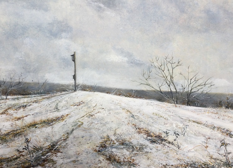 The blustery winds thrash this pole and birdhouses on a hilltop, but it remains anchored to the frozen ground on this scene near Eckville. This egg tempera was painted mostly from memory, and a small sketch I did on site oneĀ winter afternoon in January of 2022. I used a muted palette and cool pigments to capture the feelings I experienced that day.