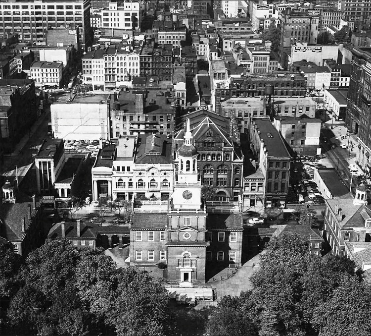 But this new construction and selective preservation came at a cost. During the 1950s, over 100 buildings—including all the buildings on the blocks to the north (the Mall) and almost all the buildings on the blocks to the east of 5th Street (except the few that dated to the 18th century and were part of the city of Ben Franklin, the Revolution, and/or associated with Philadelphia’s history as the national capital) were demolished. The aerial photograph shown here, taken in 1950 looking north from Walnut Street, shows how dense this area once was. In deciding what to retain, planners and preservationists prioritized political history: largely buildings built before 1840. What came down were many industrial and commercial structures that were deemed dilapidated or uneconomical uses of space.