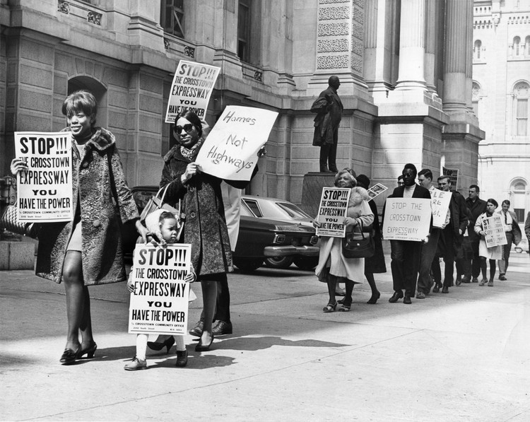 In response, a mixed-race, mixed-class anti-highway movement developed. One of the leaders of the grassroots oppositional movement was Alice Lipscomb, an African American resident of the nearby Hawthorne neighborhood. Lipscomb helped establish the Citizens’ Committee to Preserve and Develop the Crosstown Community, which joined white residents of Society Hill with black residents along most of the route and newly-arrived artists who began occupying the emptying South Street storefronts. The Committee argued that the choice of route amounted to racial discrimination, that the need for the road was unproven, and that the city lacked an adequate plan for relocation of several thousand residents in the path of the highway. They were also supported by several design professionals, including architect Robert Venturi--whose parents’ property (where his father had been a produce vendor) was in the path of the expressway--and architect Denise Scott Brown, Venturi's wife, who photographed the full length of South Street and developed alternative proposals for rehabilitating the community, rather than wiping it out. This photograph depicts activists protesting the expressway outside City Hall in 1968.