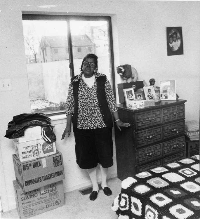 In the early 1970s, Miller joined forces with several of the newer residents of Society Hill (including Philip Price, Jr., whom you heard speaking at the 321 Spruce St tour stop) to propose the government-subsidized construction of new replacement housing for these residents on several already-cleared nearby sites. What followed was a contentious, nearly decade-long battle between groups of Society Hill residents who either supported or opposed this plan. Some residents feared this new low-income housing would diminish property values, while others advocated for the inclusion of housing that served multiple economic classes—including, in particular, these long-time neighbors. After years in court, and with the support of Community Legal Services, the Octavia Hill Seven won. Although Miller and her neighbors had to temporarily relocate out of Society Hill, by 1981, they were able to come back—thanks to the construction of three small cluster of new row houses. These new buildings include the ones before you at the NW corner of S 6th and Lombard Sts, as well as the clusters at S 6th and Addison Streets and S 6th and Pine Streets. Miller moved into the unit at 540 Pine Street, inside of which she is depicted in this 1982 photograph. You will pass all of these developments on your way to the next tour stop.