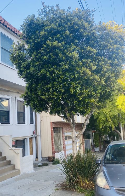 At 4148 24th Street is a water gum. It also goes by the name small leaf tristania, and the scientific name is Tristaniopsis laurina. There are several other water gums on this block. Water gums have recently been the most commonly planted tree in San Francisco – they’re resistant to almost all pests, they’re easy to prune and maintain, and they don’t break sidewalks or get too big.