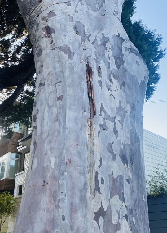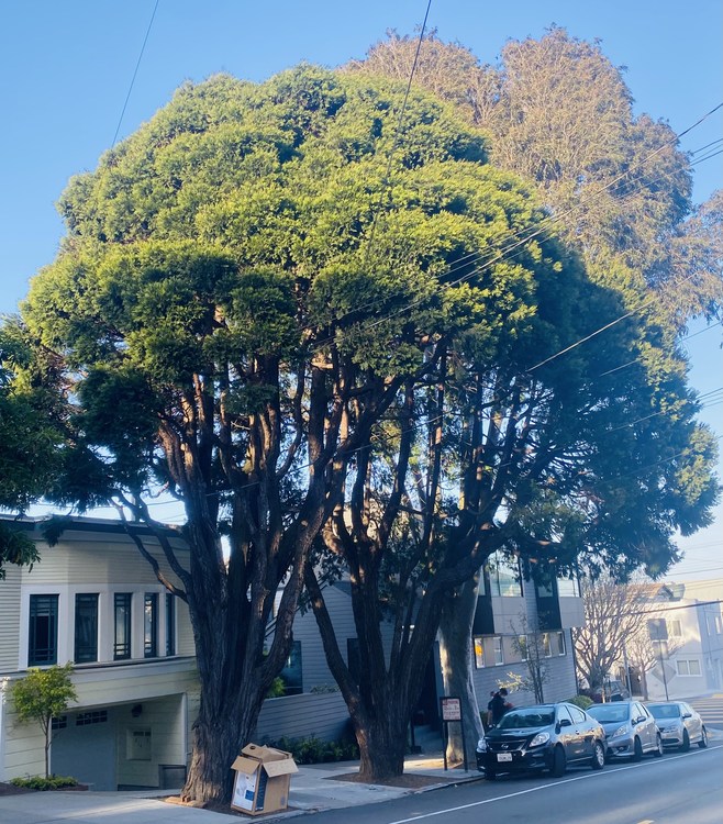 Continue south on Diamond to Clipper Street, and turn right. At 514 Clipper Street are two large incense cedars (native to California and Oregon); the scientific name is Calocedrus decurrens). The tree just downhill from them on Clipper is a spotted gum (Corymbia maculata), with beautiful mottled bark.