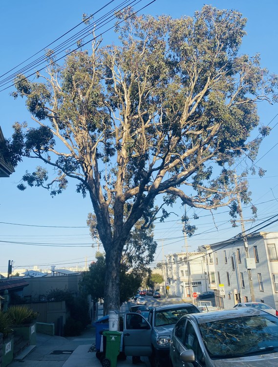 At 416 Clipper Street is a silver dollar gum from eastern Australia. The scientific name is Eucalyptus polyanthemos.