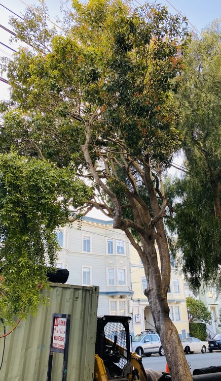 Cross Noe Street, and turn right to head south on Noe. At 1295 Noe, the tree closest to the corner is a diamond-leaf pittosporum from eastern Australia – the scientific name is Auranticarpa rhombifolia. This tree may not look like much, but it’s the only one of its species in all of San Francisco, so that’s something! If you’re arriving in the fall, you may notice the tree’s characteristic orange fruits.