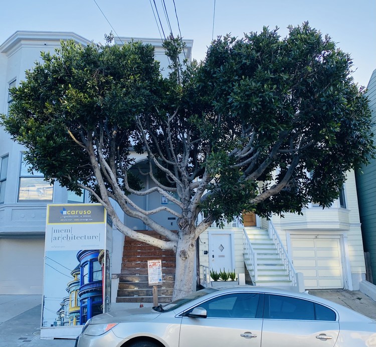 Turn left on Sanchez Street, heading north. Walk past Clipper Street. At 1226 Sanchez is a ficus tree from south and southeast Asia – the scientific name is Ficus macrocarpa. In the 1970s and 1980s, this was one of San Francisco’s most planted trees – city planners loved it because it grew quickly and thrived, filling the previously barren streets with green. More recently it has fallen out of favor as we’ve learned that the roots are bad sidewalk breakers, the dense foliage blocks light from second and third-story apartments, and the branches grow brittle with age.