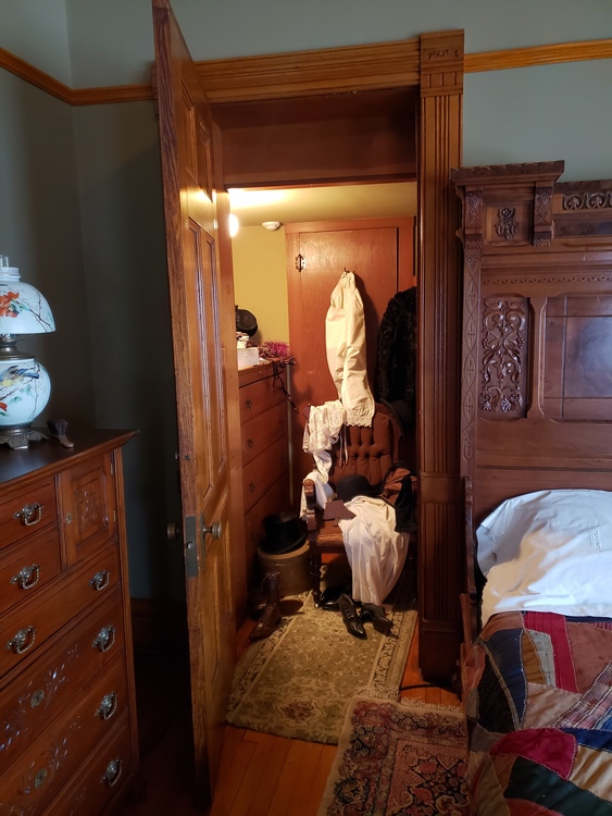 El armario tenia dos puertas. La puerta mas lejana tenia acceso a la habitación del mayordomo de manera que cuando la ropa estuviera limpia y planchada podían ser regresadas al armario sin molestar a la familia. Este es un gran ejemplo de la separación entre la familia y los sirvientes.