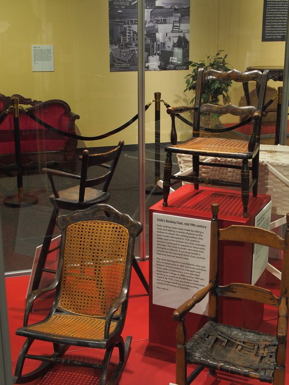 The chair belonged to Cora Roberts, who was born in Kalamazoo in 1861 to Daniel and Mary Roberts. Daniel worked as a druggist and book seller in Kalamazoo. Cora attended Kalamazoo College in 1880, and by 1900 was working as a clerk at the Michigan State Capitol. By 1930, Cora was back in Kalamazoo, and no longer working, but was renting rooms in her home to boarders.