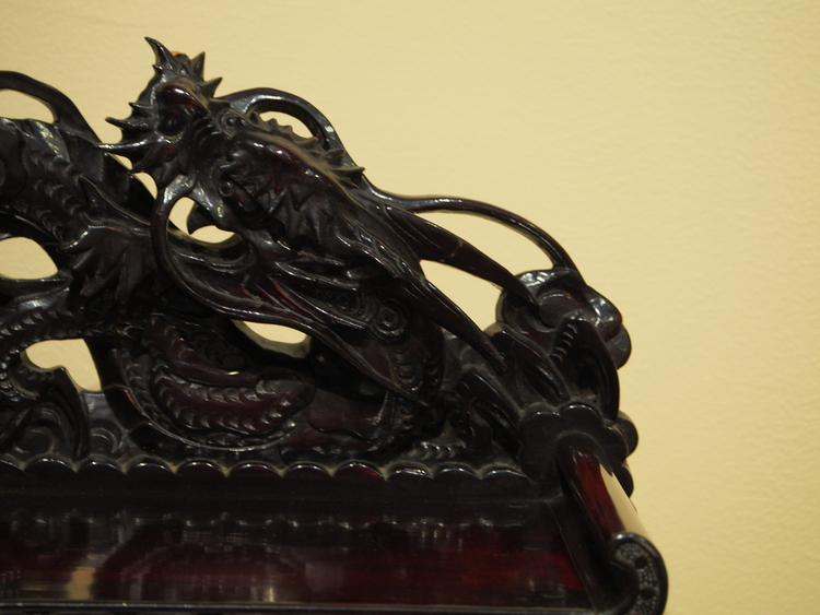 This desk and chair have a connection to Washington, DC, having belonged to Senator Julius C Burrows and his wife Ida (née Hinman) Burrows. Burrows moved to Kalamazoo in 1860 and opened his first law practice. From 1866-1870, he served as prosecuting attorney for Kalamazoo County, and served as Michigan representative from 1873 to 1911. These pieces were sent to Alfred C Connable following Burrows’ death in 1915. The Kalamazoo Gazette documented the donation of these pieces to the museum in 1929, and notes their presence in the Burrows’ home in Washington. The 1929 article describes the beautiful features of the desk, including the dragons and delicately carved chrysanthemums made of ivory.