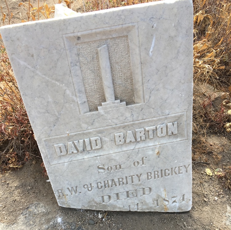 David Barton Brickey was struck down in the prime of life at age 20 from spinal meningitis. He was born in 1854 in Shasta County, CA, a booming mining community at the time. His parents were Risdon W. and Charity Brickey, who married in Missouri, lived in Arkansas for a time, and later divorced. David is listed as living with the William Sharp family in 1860 though his father, a master blacksmith by trade, lived nearby. David’s obituary reads, “He was steady and industrious and beloved by all. A loving father and kind friends ministered to his wants till mortal aid could do no more.