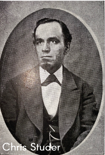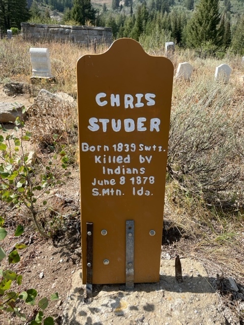 Chris Studer was born in Zurich Switzerland in 1839. While farming in Illinois in 1859, he made the acquaintance of Jacob Dellenbach, and, at the breaking out of the Pike's Peak excitement, they struck out for that place, crossing the plains with an ox team. Meeting with disappointment in Colorado, they continued on to California where they engaged in placer mining. In 1865, together they came to Silver City, and took up a wood ranch until the summer of 1868, when, in partnership with Joseph Gross and Frank Schuster, they became the owners of the Blue Gulch gravel claim on Florida Mountain. According to the local newspaper, at the "Indian outbreak" in June, 1878, Mr. Studer was one of the first to volunteer his services, and at the disastrous engagement at South Mountain, on June 8, 1878, gave up his life at age 39 in defense of the hearths and homes of Owyhee County. His funeral, which took place under the auspices of the Odd Fellows, was one of the largest witnessed in this locality, citizens and strangers numbering several hundred participating in the sad demonstration.