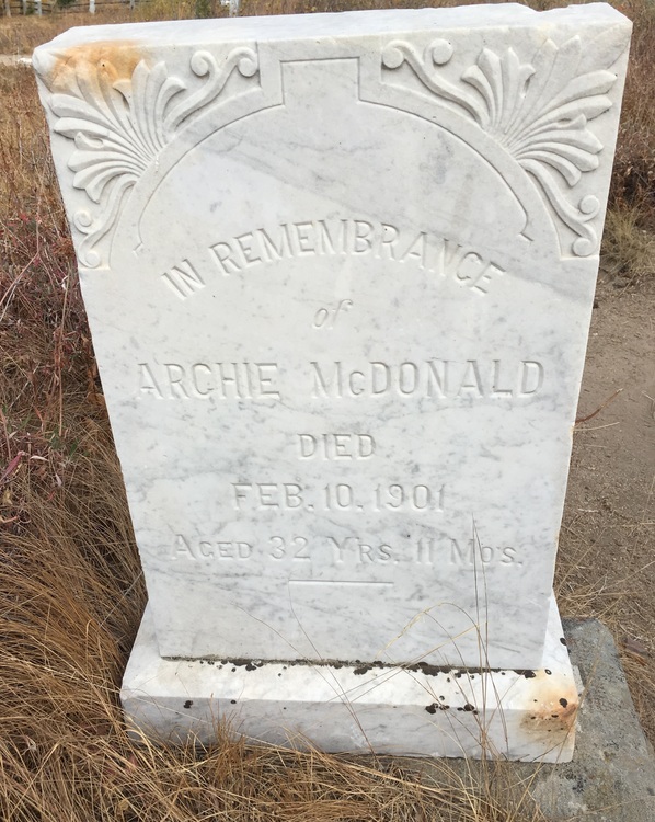 Archie McDonald, age 32 years, died on February 10, 1901, of consumption. He was born near Lucknow Ontario Canada in 1868 and followed quartz milling in Montana until his health was broken by the deadly fumes incident to mining work. He came to Owyhee County in the summer of 1891 and, on account of ill-health, engaged in the saloon business until his death. Archie was a man of many friends, honorable in his business dealings, a gentleman, and his death was sincerely regretted by everyone who enjoyed his acquaintance.