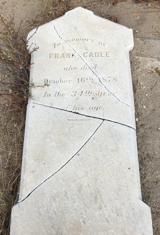 Frank Cable died at age 34 in 1878 from injuries he sustained in the Phelix Mine when a boulder fell on him. He was born in Michigan and traveled with his parents at the age of five to California during the 1849 gold rush. The family moved to Oregon for a while before Frank and his brother Marion set out to seek their fortunes in the Owyhee mines.
