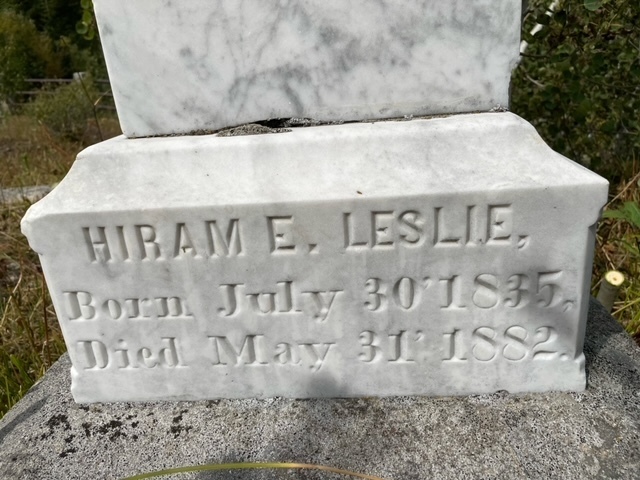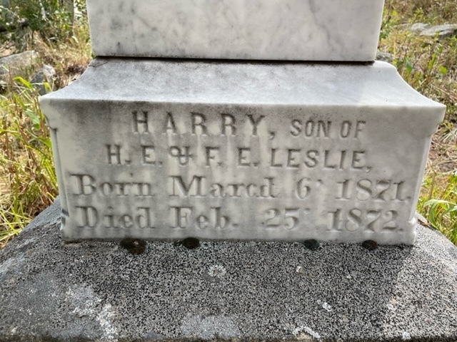 The gravestone also marks the death of Hiram and Florence’s infant son Milo Harris Leslie in February 1872. Milo died just ten days before his first birthday. His obituary doesn’t note the cause of death.