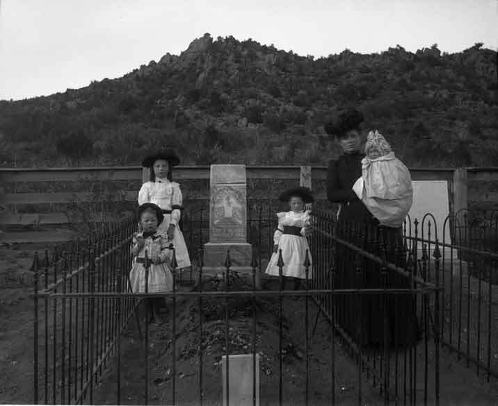 Ruby City Cemetery: All that remains of Ruby City is the second Ruby City cemetery. The first cemetery was placed at the base of Florida Mountain, but residents soon found the graves were contaminating Jordan Creek. The cemetery, and the fourteen bodies buried there, were moved to the current site in 1866. The cemetery can be seen from the BLM restrooms at the last junction before arriving at Silver City (Latitude: 43.02957, Longitude: -116.73318). At least three young men killed in mining accidents are buried in the Knights of Pythias portion of the cemetery, including Edwin Varker. This picture is Edwin's widow and four children at Edwin's grave.