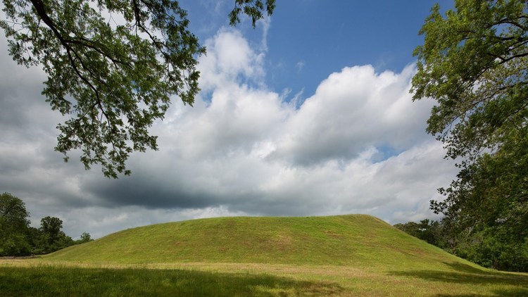 This next site is one of the highlights of the parkway. Emerald Mound is the second-largest Mississippian Period ceremonial mound in the United States. Built and used between the years 1200 A D and 1600 A D, this 35-foot-high mound covers eight acres and measures 770 feet by 435 feet at its base. Two secondary mounds sit on top of the primary mound, bringing the total height to approximately 60 feet. Early records suggest there were six, smaller mounds located along the sides of the primary mound, but visual evidence of these smaller mounds has long since disappeared.