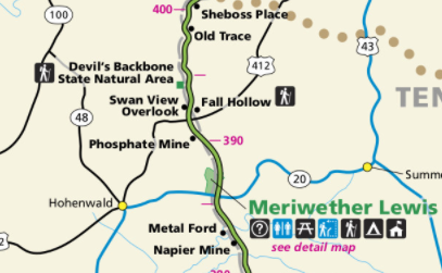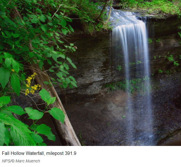 This next location is one of the highlights on the parkway. It is located at milepost 391 point 9. Almost immediately after leaving your vehicle you can hear the water descending over the twenty foot drop creating this waterfall, called Fall Hollow. If you continue down this short trail you will come to a viewing platform that views the 20-foot tall waterfall. The trail and platforms get slippery due to the water and moisture of the area. Please watch your step. You cannot access any section of the original trace at this location.