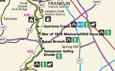 You are approaching Garrison Creek and the Highland Rim Section at the northern terminus of the parkway at milepost 427 point 6. Named for a nearby 1801 U S Army post, Garrison Creek is a trailhead for horseback riders and hikers on the Highland Rim Trail. Plenty of horse trailer parking is available. This part of the Natchez Trace National Scenic Trail is 20 miles in length. From the Garrison Creek trailhead you will most likely see people riding horseback south to Tennessee Highway 50, milepost 408, near the Gordon House. This is one of 19 locations on the parkway that you can visit a section of the original trace.